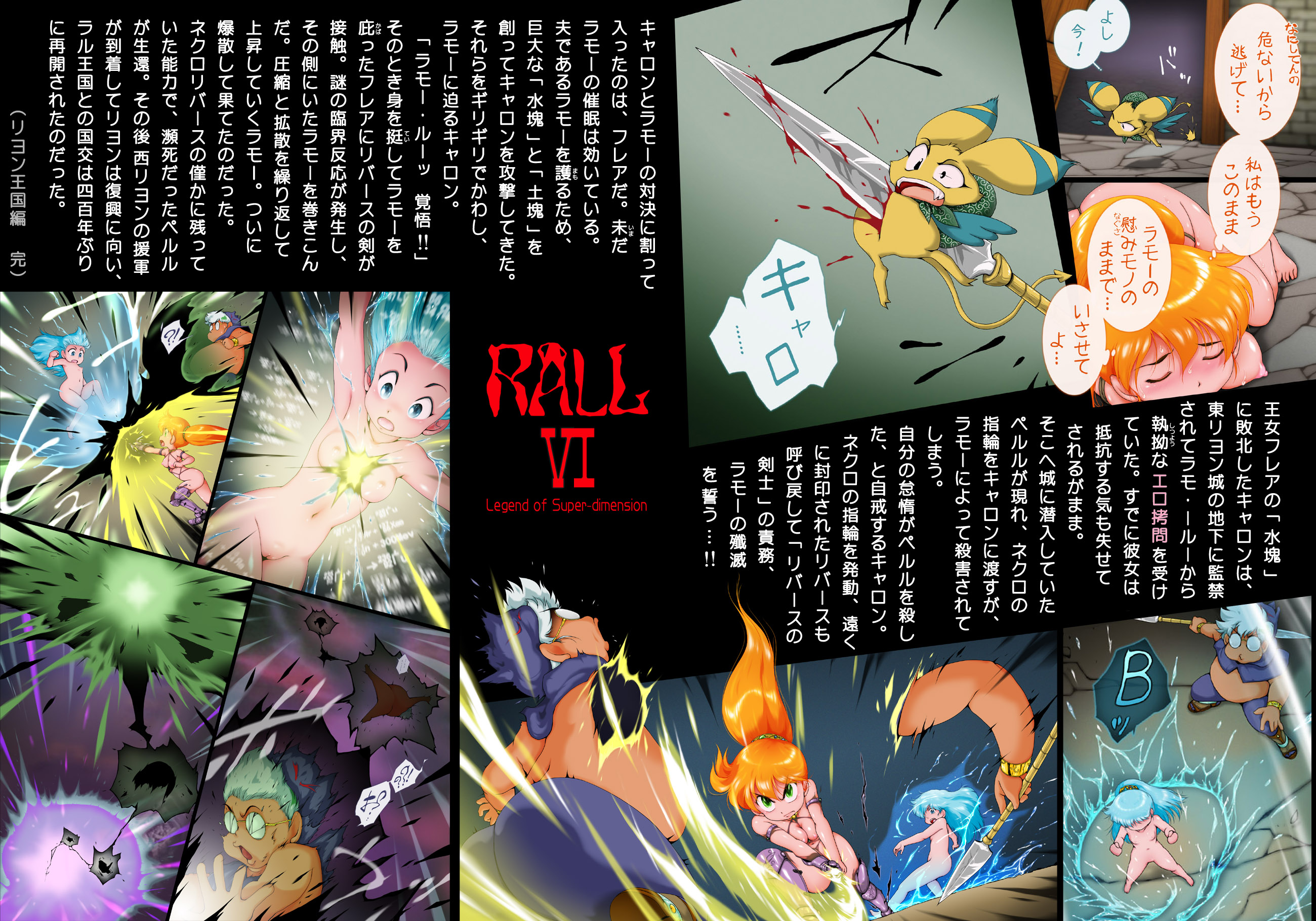 フレア(正妻)とキャロン(愛人)がラモーを巡って修羅場になれば面白いな。 …というのがリヨン王国編の出発点でした。ですのでラストの戦闘シーンには、 どうしてもがっつりページを割きたかった。 (非エロページが続くけど、2人の王女はどっちも殆ど全裸だし、まぁイイかなーってね) 一応、満足いく終わり方になったと思います。 ラルとリヨンの400年前からの因縁。ラモーとキャロンの宿敵同士の愛。 フレアの「禁断の力」、その破滅的なパワーと「リバースの剣」の激突が、 全てを掻き散らし、薙ぎ払う!! そして結果的に二股かけていた魔王に待ち受ける運命とは…ッ?!